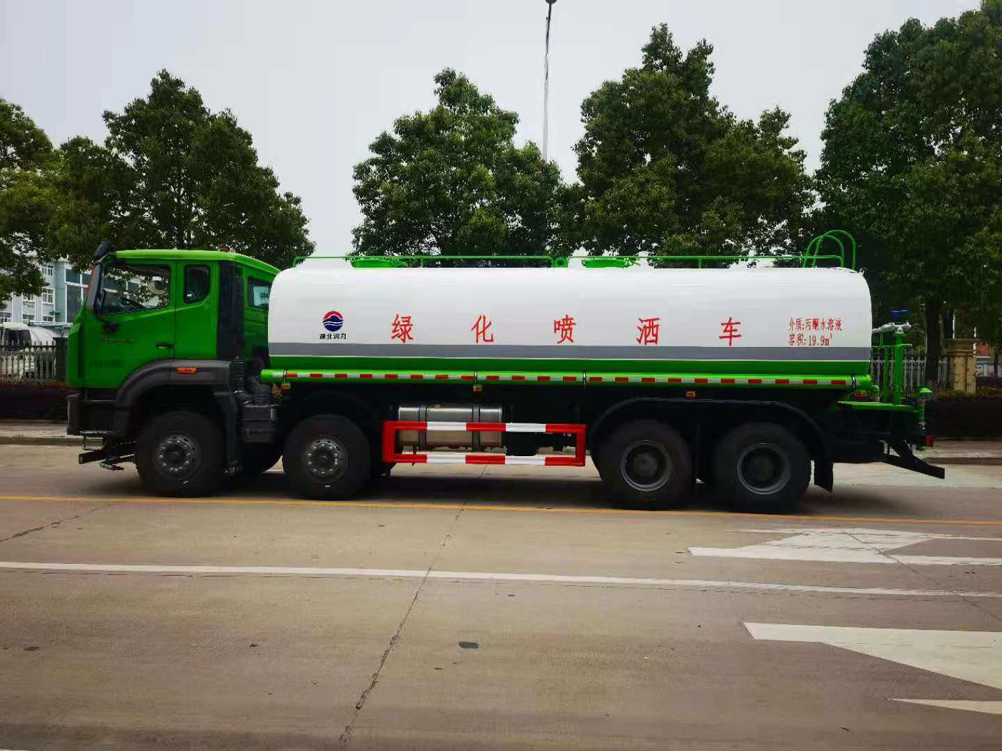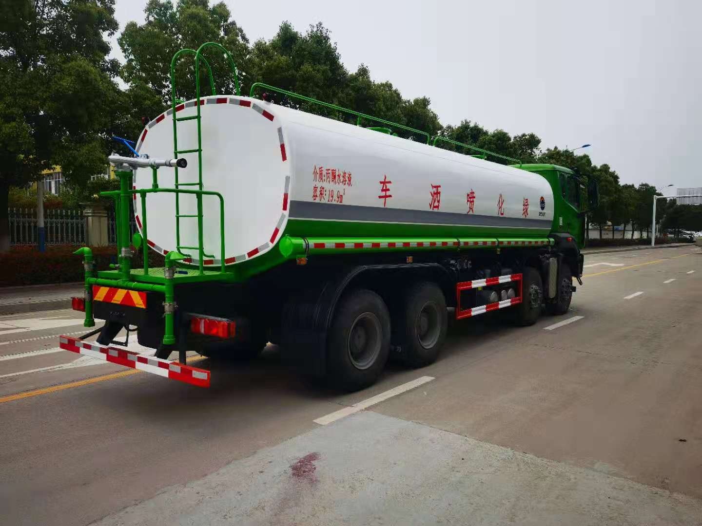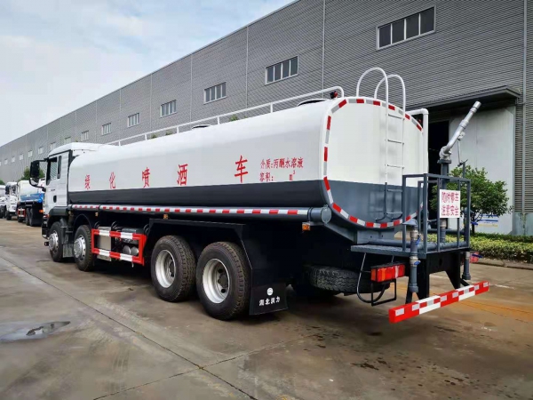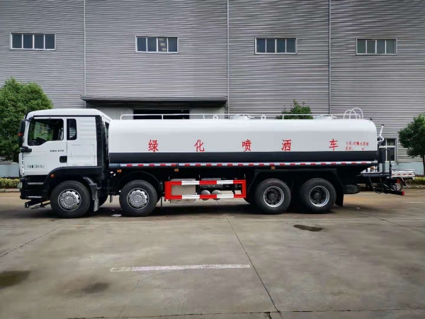 罐體容積25立方,采用國標4mm鋼板,內有隔板,采用60/90灑水泵,可抽可排,前噴后灑,帶側噴,后平臺高射水泡,射程25m右側兩個高位花灑,罐體顏色白/綠,采用優質油漆,其它按灑水車要求生產。