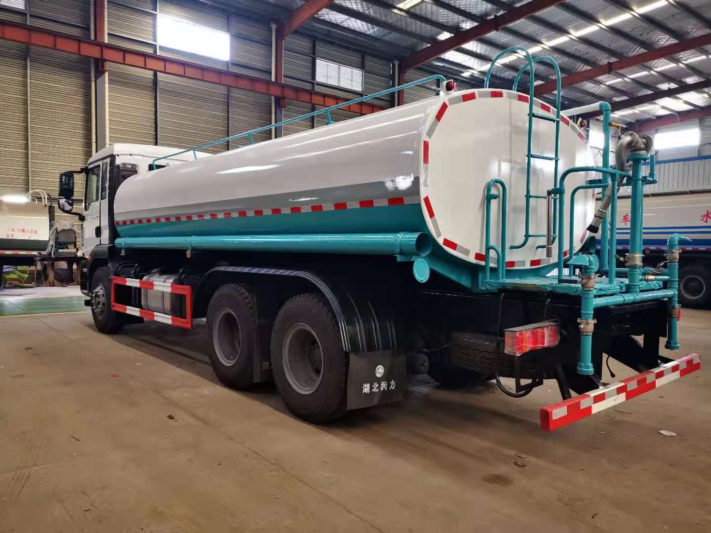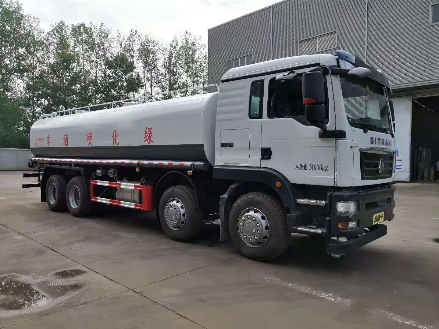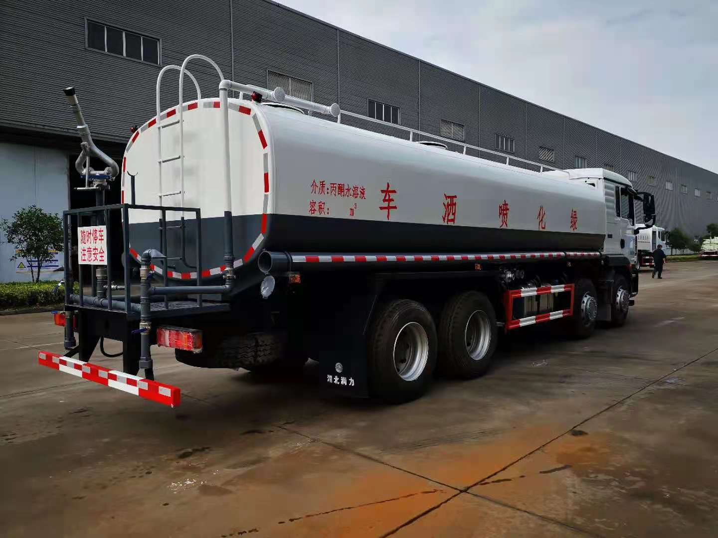 罐體容積25立方,采用國標4mm鋼板,內有隔板,采用60/90灑水泵,可抽可排,前噴后灑,帶側噴,后平臺高射水泡,射程25m右側兩個高位花灑,罐體顏色白/綠,采用優質油漆,其它按灑水車要求生產。