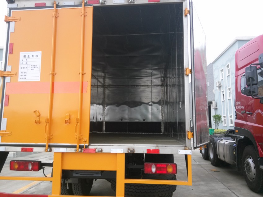 備注:廂體頂部封閉,不可開啟.運送危險貨物的品名為液化石油氣,丁烷,丙烷,打火機或打火機加油器.運送危險貨物類項號為:2.1,2.1,2.1,2.1.運輸**容器包裝的易燃?xì)怏w氣瓶.當(dāng)整車長為8500,對應(yīng)軸距為(mm)4700,后懸為(mm)2370,離去角為16°,內(nèi)部廂體尺寸為(mm):6100×2380×1950;當(dāng)整車長為(mm)9000,對應(yīng)軸距為(mm)5000,后懸為(mm)2570,離去角為15°,內(nèi)部廂體尺寸為(mm):6600×2380×2000。側(cè)防護采用碳鋼/Q235B,螺栓連接。后防護采用碳鋼/Q235B,焊接,截面高100mm,截面寬50mm,下邊緣離地高530mm。選裝方便卸貨的液壓升降尾板和側(cè)面不開門,廂體顏色可變化,文字噴涂位置可變化。隨底盤選裝駕駛室;僅選用前盤式制動器,前置排氣管,子午線輪胎的底盤;該車安裝具有衛(wèi)星定位功能的行駛記錄儀;ABS型號/廠家:3631010-C2000/東科克諾爾商用車制動系統(tǒng)(十堰)有限公司,4460046440/威伯科汽車**系統(tǒng)(**)有限公司.