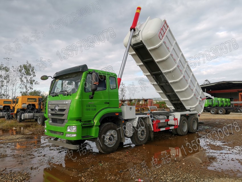 10檔變速箱,11.00鋼絲胎。箱體容積26方,前頂自卸,上部兩個2450*1000的進料口,尾蓋可全部打開。